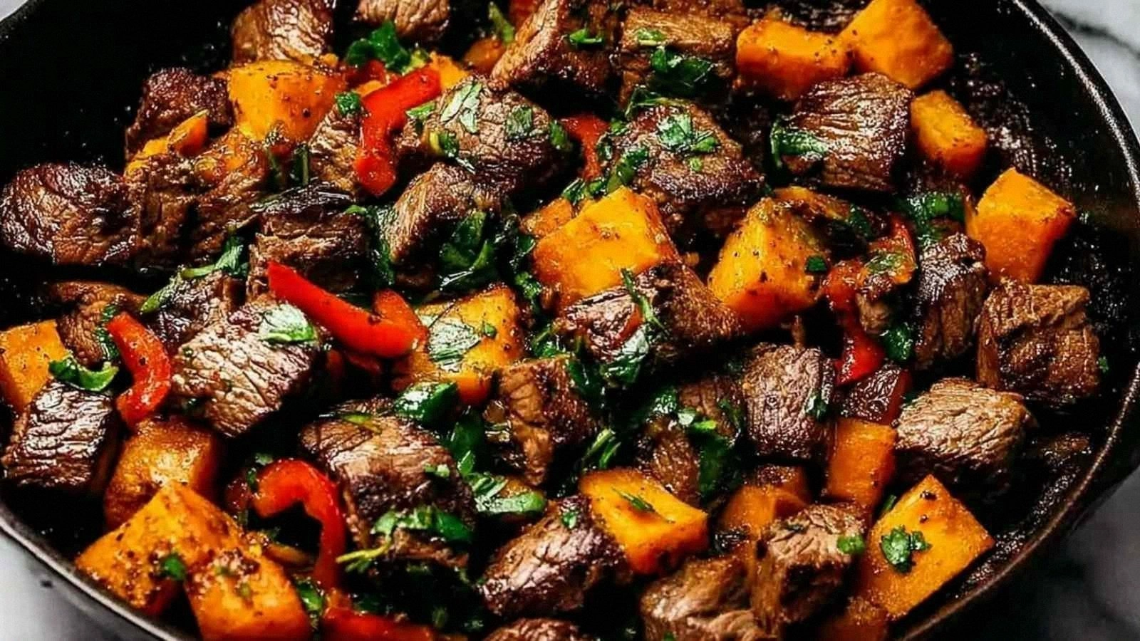 Picture this: a bright, golden pan, the steak searing to a caramelized crust while the sweet potato cubes roast to a caramelized amber, the red and green peppers slicing into crisp ribbons that pop with color. The kitchen fills with a smoky, peppery aroma that makes your eyes water in a good way. You can hear the gentle hiss of the oil, feel the heat radiating from the skillet, and taste the first bite—juicy steak with a hint of paprika, a touch of heat from cayenne, and the subtle sweetness of the potatoes. Every element is balanced like a well‑orchestrated symphony, and the texture is a delightful contrast of crispy edges that shatter like thin ice and tender, melt‑in‑your‑mouth meat. It’s the kind of dish that makes you feel like you’ve discovered a secret recipe that everyone will ask for.